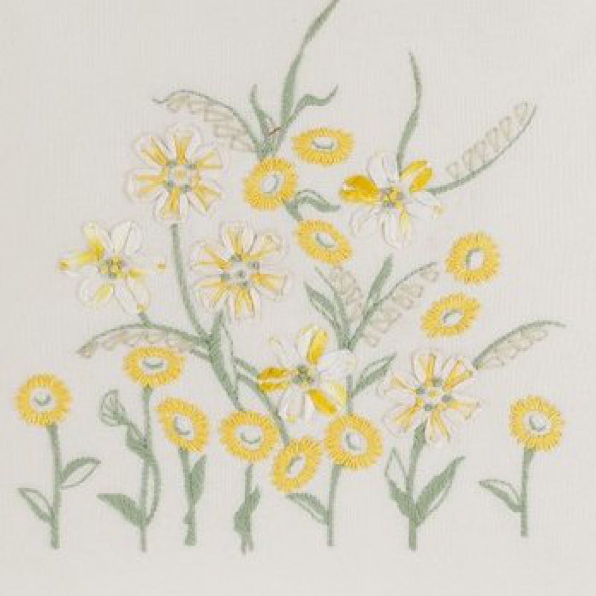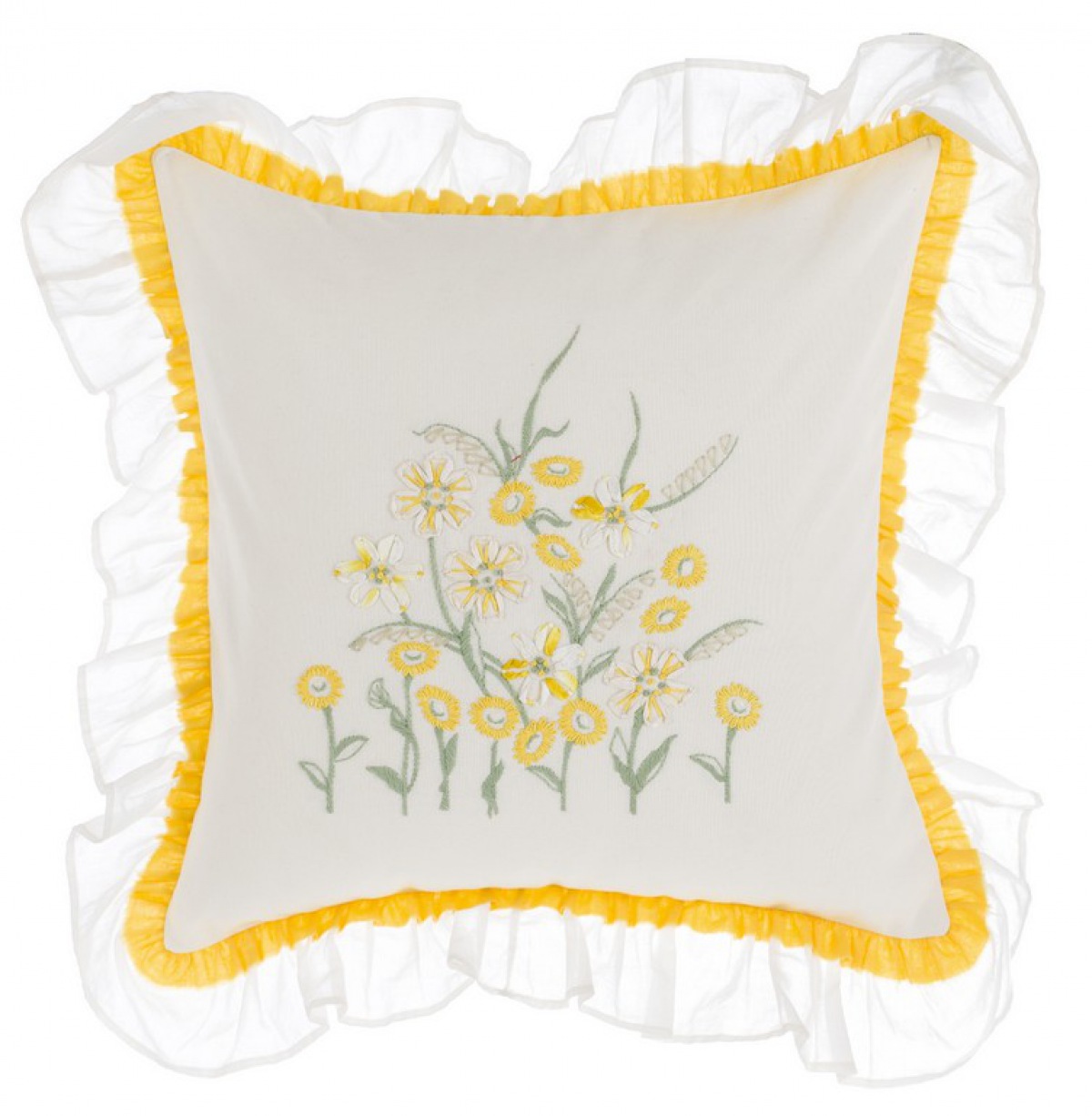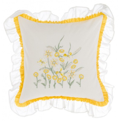 Das Kissen mit dem schönen Margeritenbouquet hat eine feine Doppel-Rüschen Umrandung.