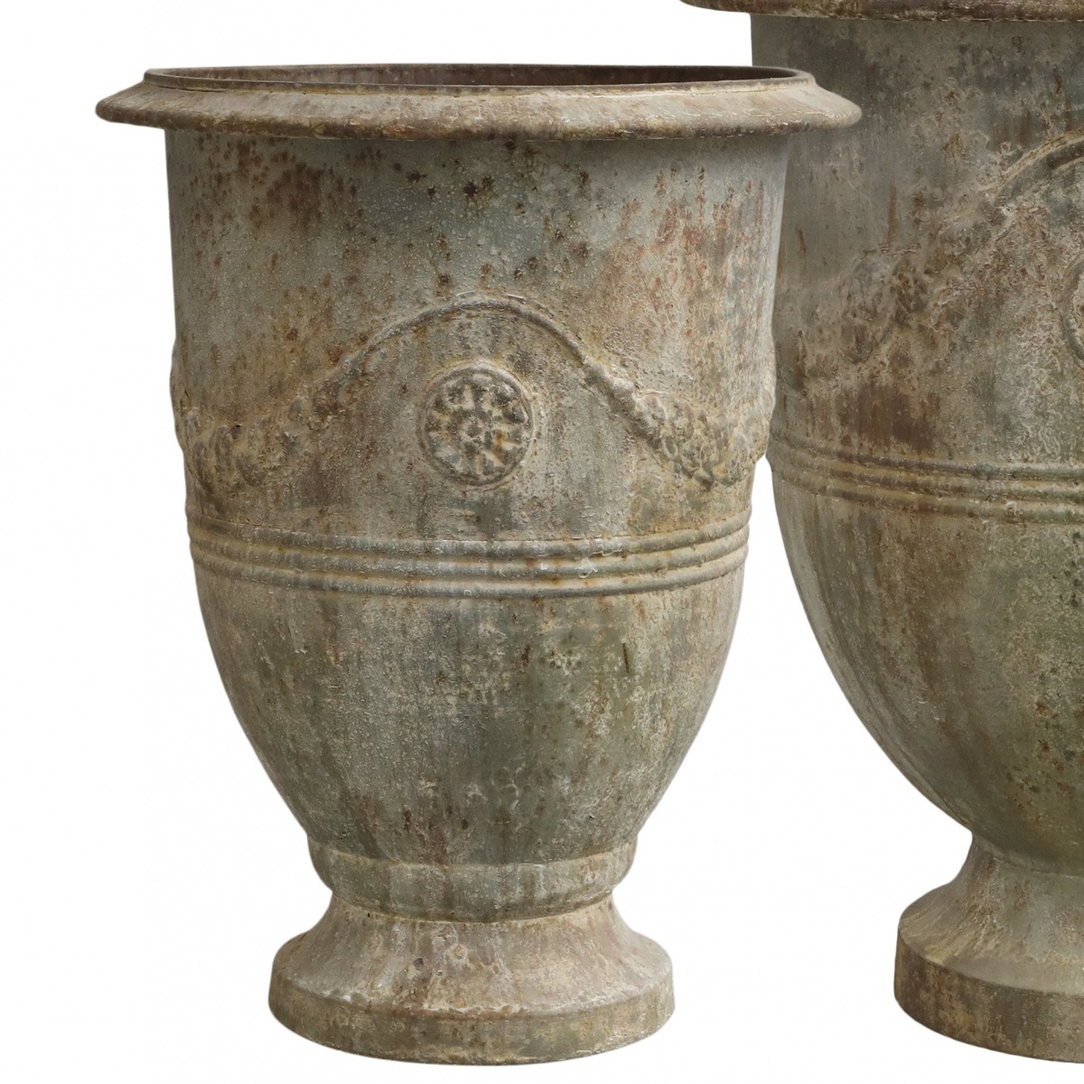 Die Antik Patinierung in unterschiedlichen Nuancen verleiht den prachtvollen Amphoren mit klassischen Formelementen ihren einzigartigen Charme - Giardino romantico.