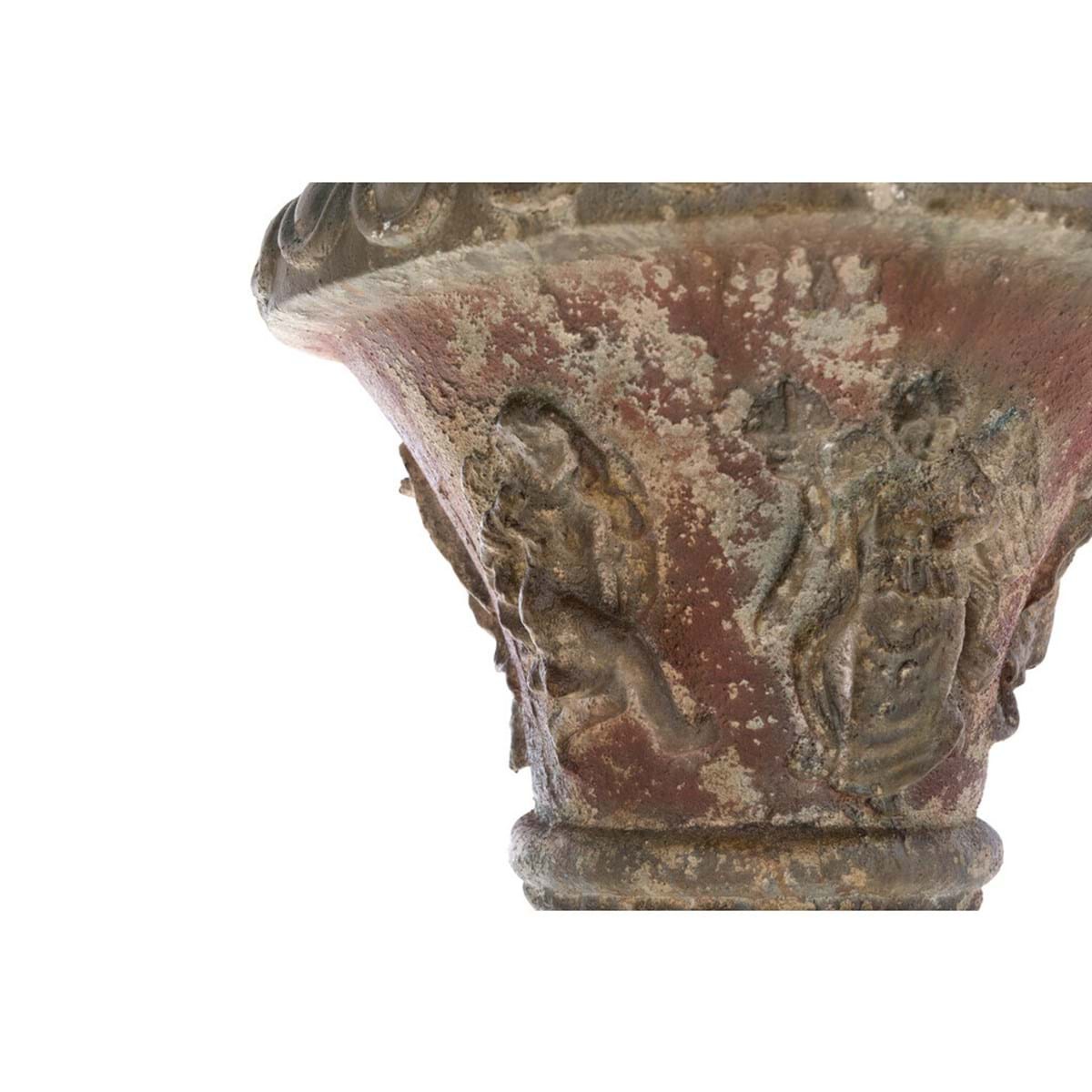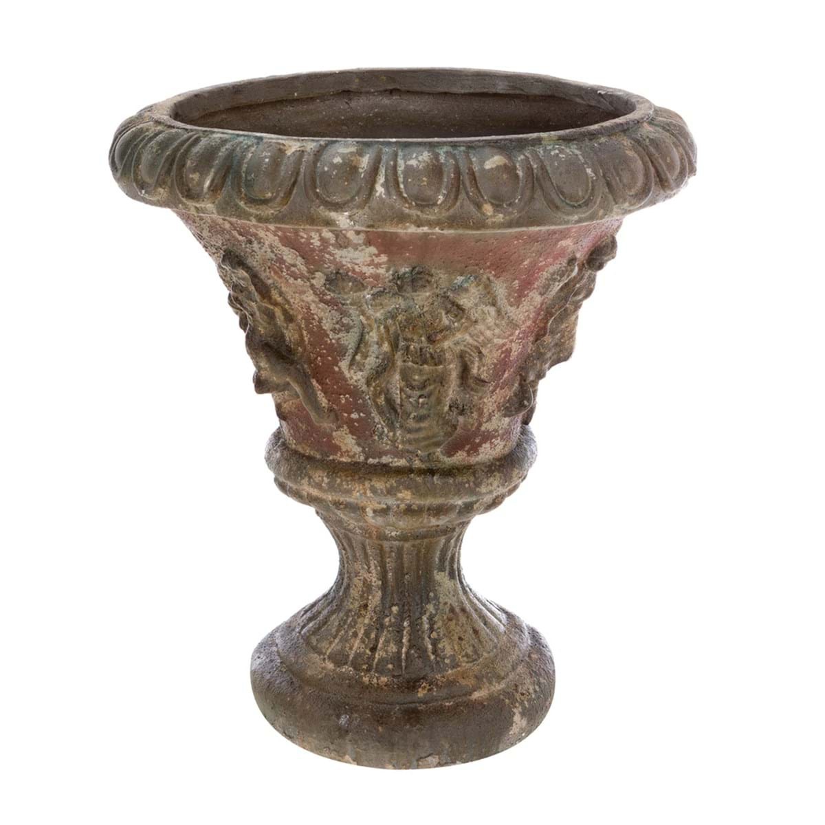 Ein edles Pflanzgefäß für romantische Strauchrosen mit duftenden Blüten. Die nuancierte Antik Patinierung betont die Plastizität der Form und des Musters.