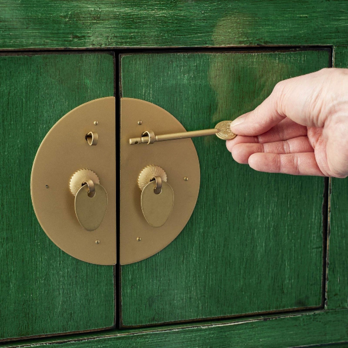 Besonders bemerkenswert ist der sogenannte „Möbelstangenverschluss” mit zwei runden Beschlägen mit Ösen, durch die der waagrechte, dekorative Stab geschoben wird, um die beiden Türen zu verriegeln.