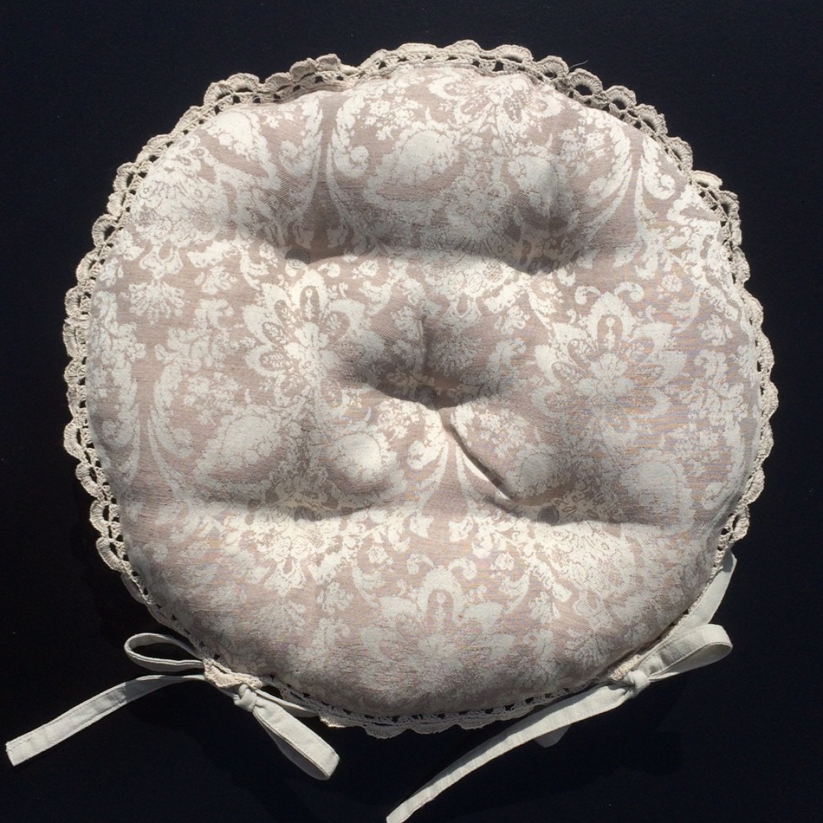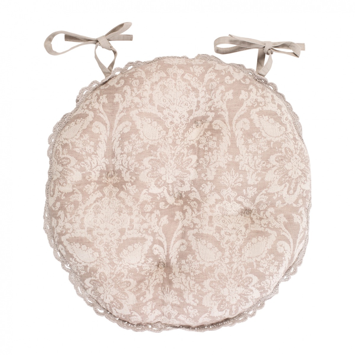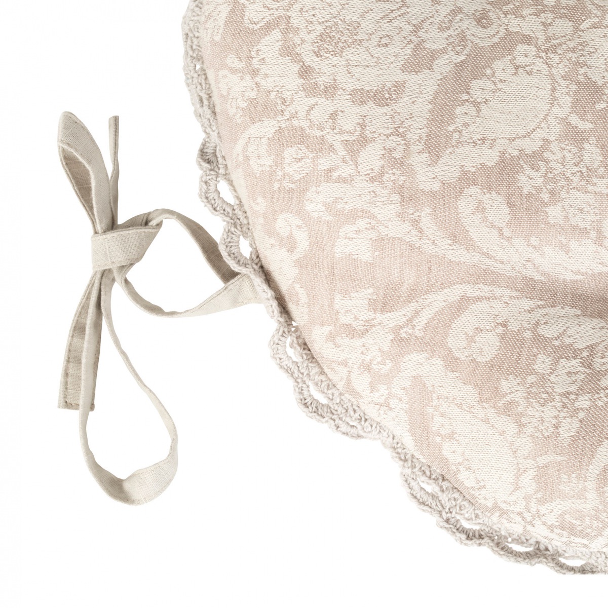 Die feine Borte ergänzt stilvoll das florale Muster der sanften helleren und dunkleren Naturleinen-Farbtöne, auf der Rückseite ist das Sitzkissen unifarben beige.