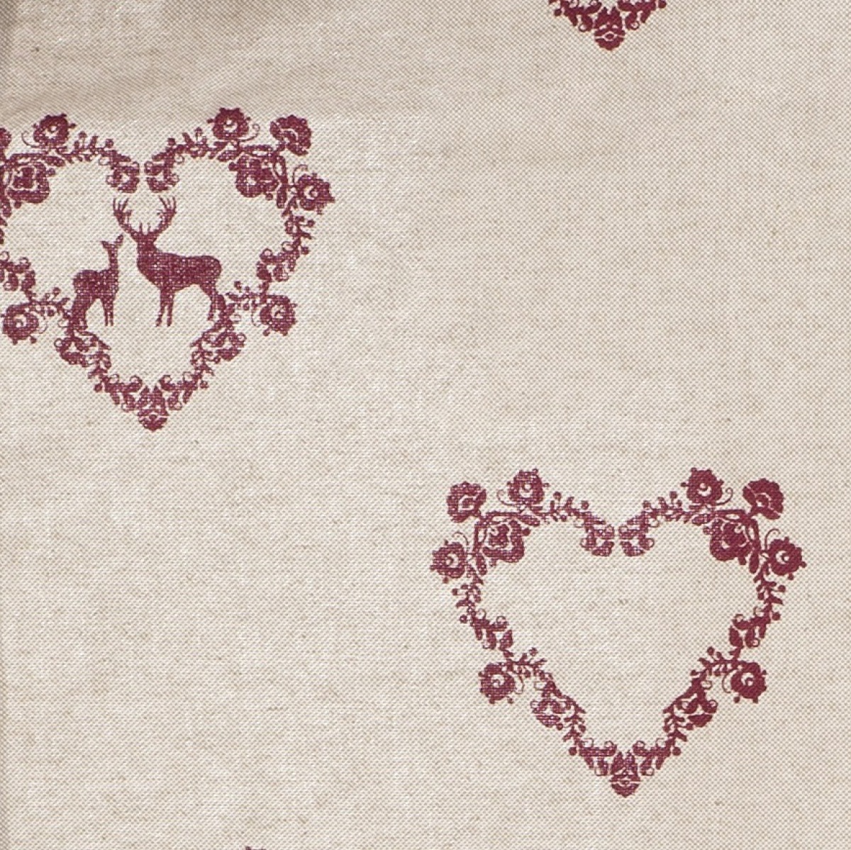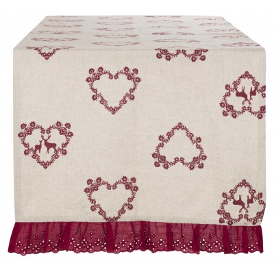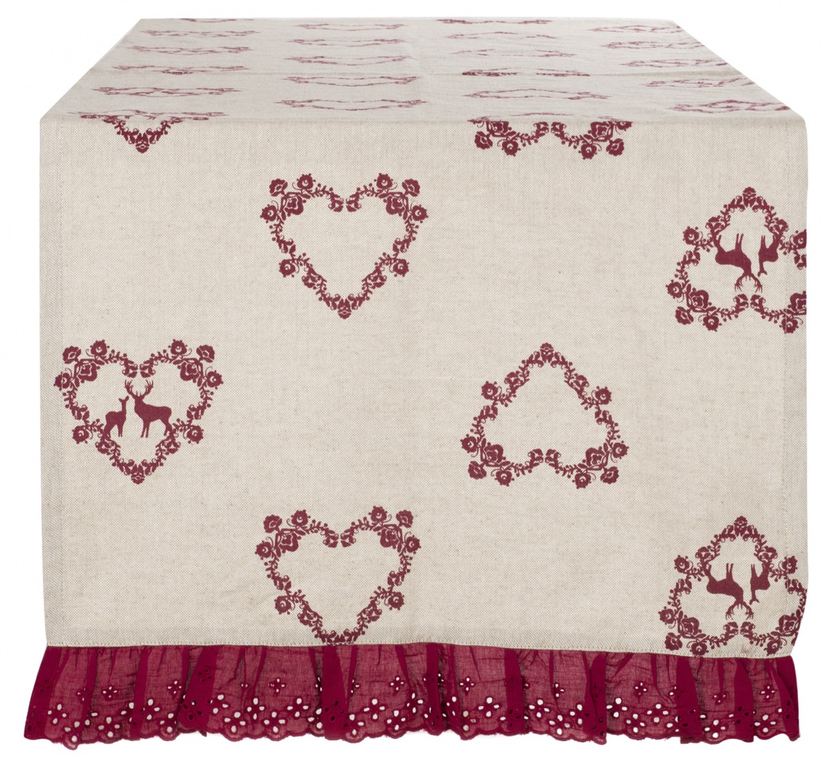 Alpine Gemütlichkeit mit Herz und Hirsch in den klassischen Landhausstil-Farben Rot und Natur. Die kleine Rüsche verleiht dem Läufer einen romantischen Akzent.