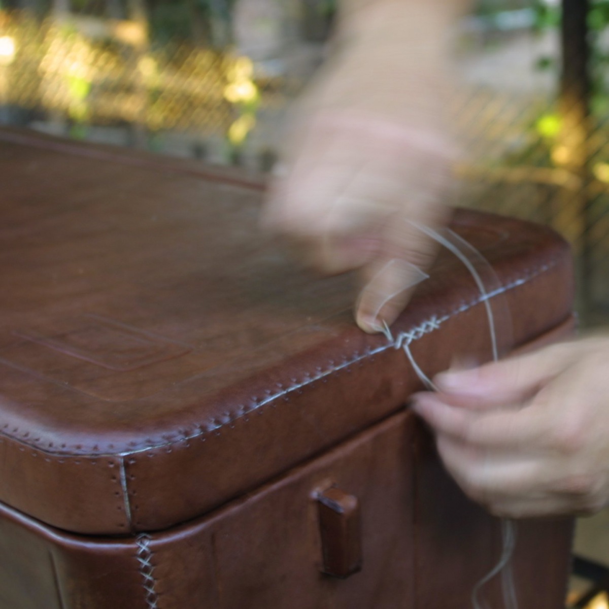 Ein Metalleimer wird in Handarbeit kunstfertig komplett mit Leder bezogen und mit funktionellen Zierstichen versehen. Eignet sich ideal für Kaminholz, Tannenzapfen und Kienspäne. Auch als edler und zeitloser Ordnungshalter für Zeitungen etc. nutzbar.