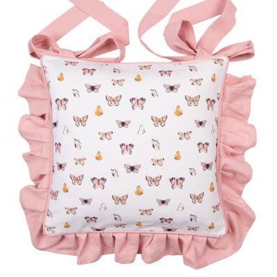 Zauberhafte zarte Schmetterlinge und dekorativer Rüschenrand, die Bändchen fixieren das Polster rutschfest.