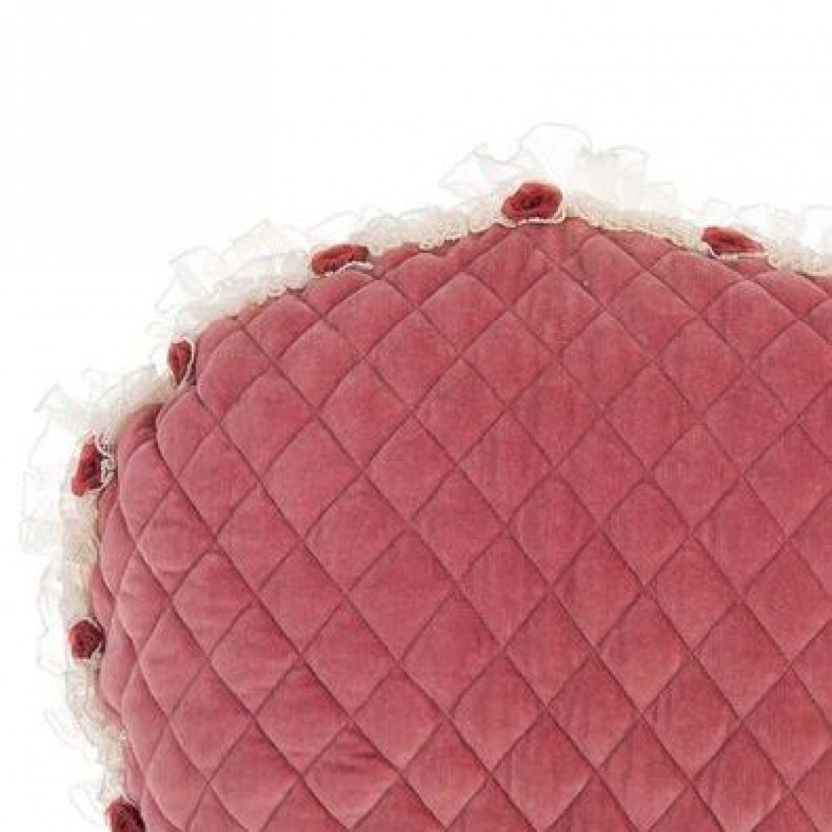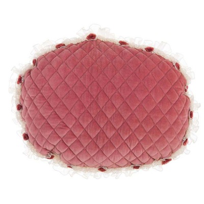 Der weiche, seidenzarte Baumwolle Samt Velours erhält durch die Steppung noch mehr Charme und die kleinen roten Rosenblüten, die Borte und zarte Spitze verleihen Form und Material entzückende Akzente.