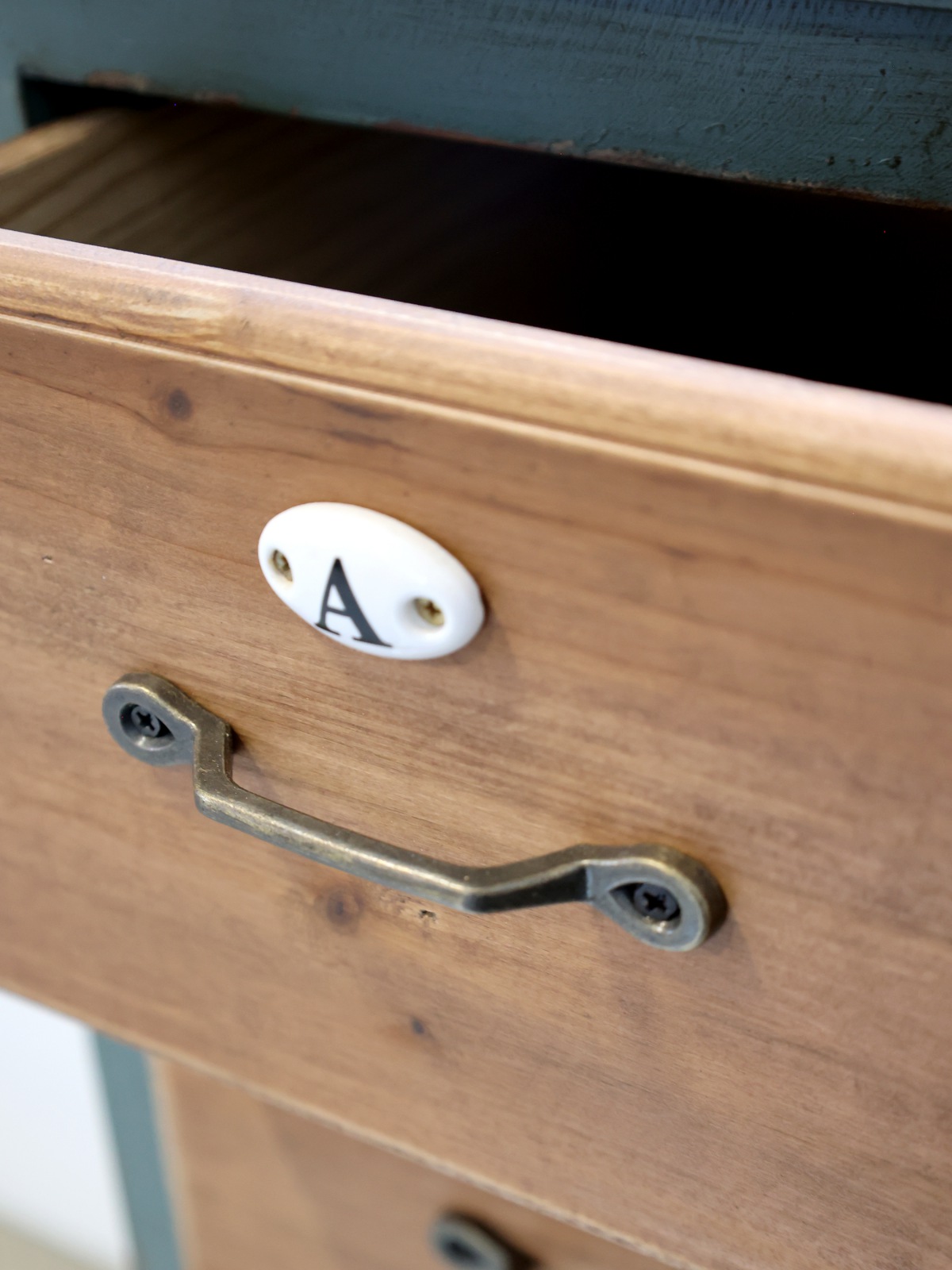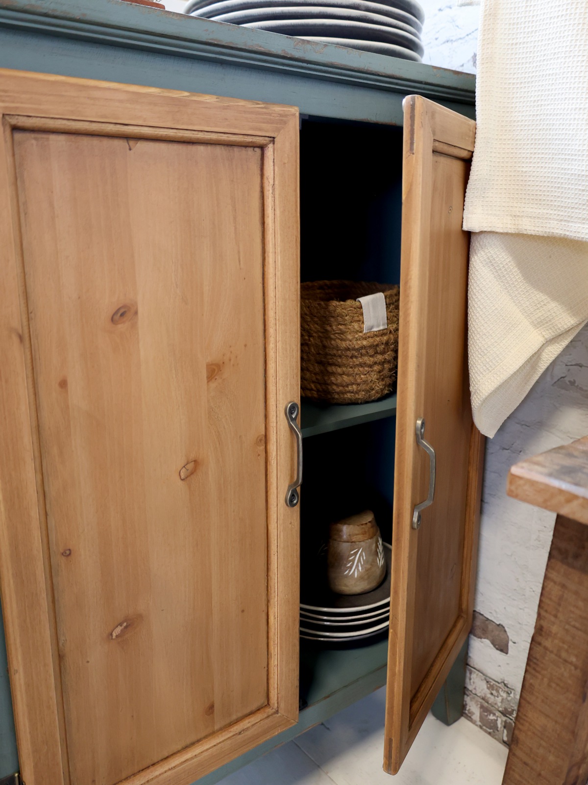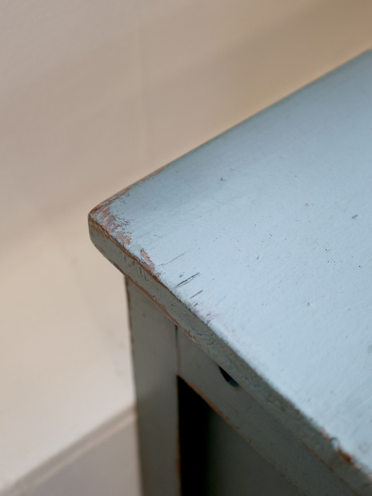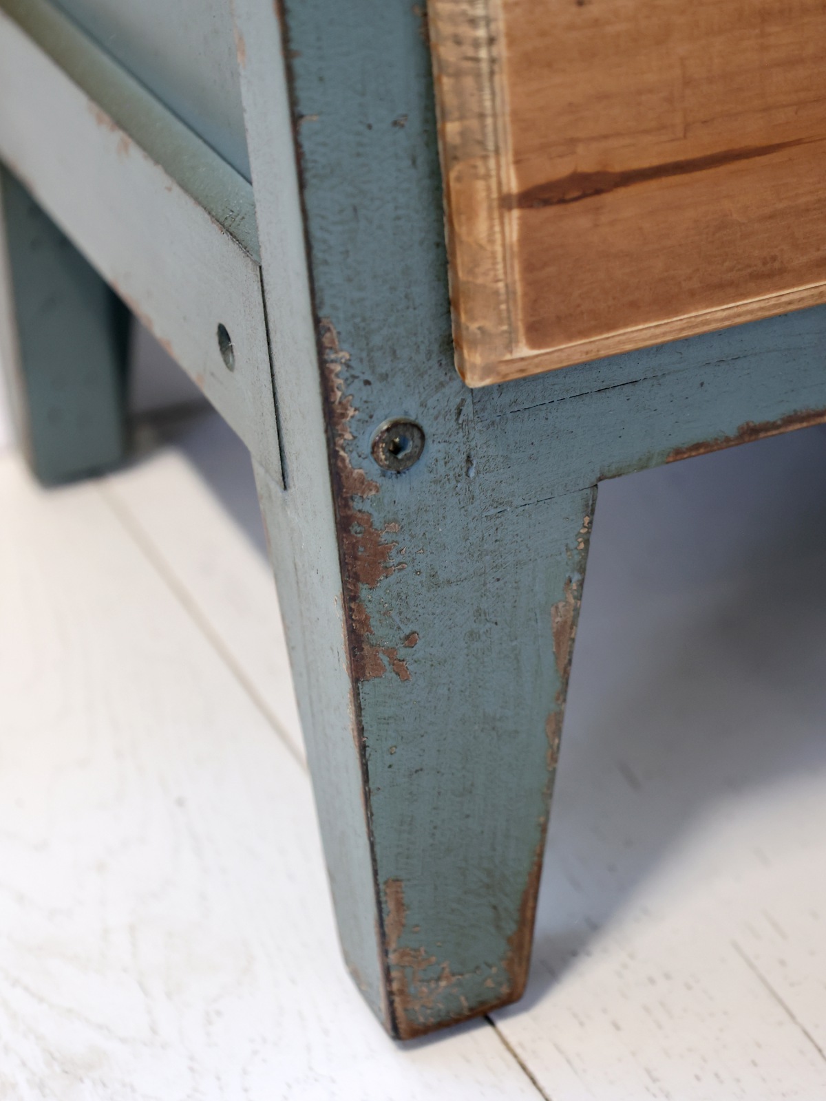 Material: Tannenholz, Sperrholz, Eisengriffe, Lackierung mit dezenter Antik Patinierung,