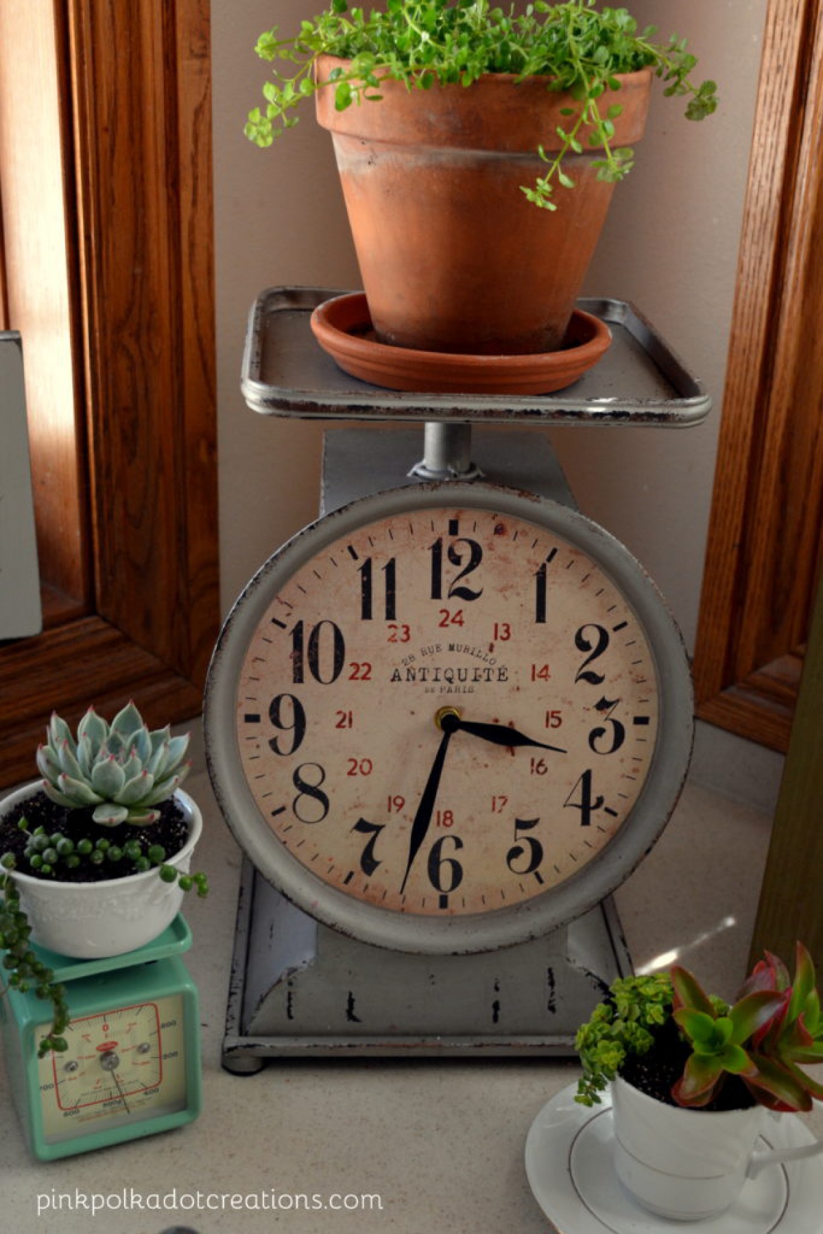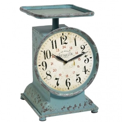 Originelle und außergewöhnliche Uhr in Form einer Waage im Vintage-Stil. Die Uhr ist blau/grün, antique-style Patinierungen verleihen dem funktionellen Dekorationsobjekt Charme.