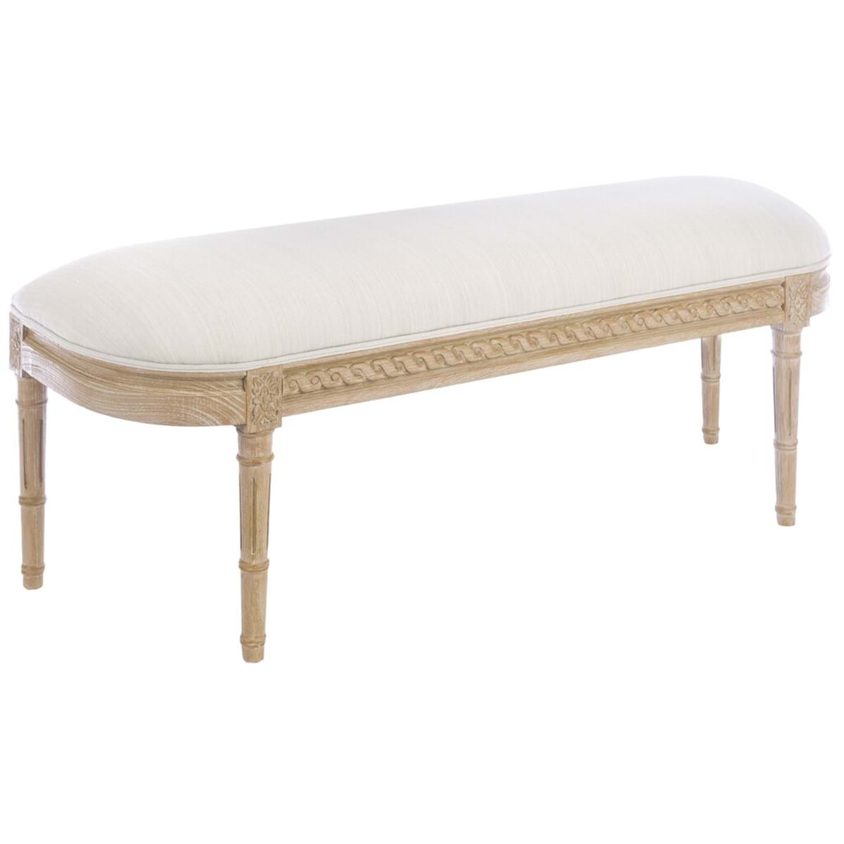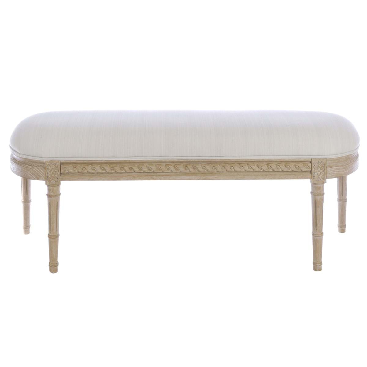 Zierliche, elegante französische Sitzbank mit dekorativen, gedrechselten Beinen und schlichter Polsterung in einem neutralen Farbton.
