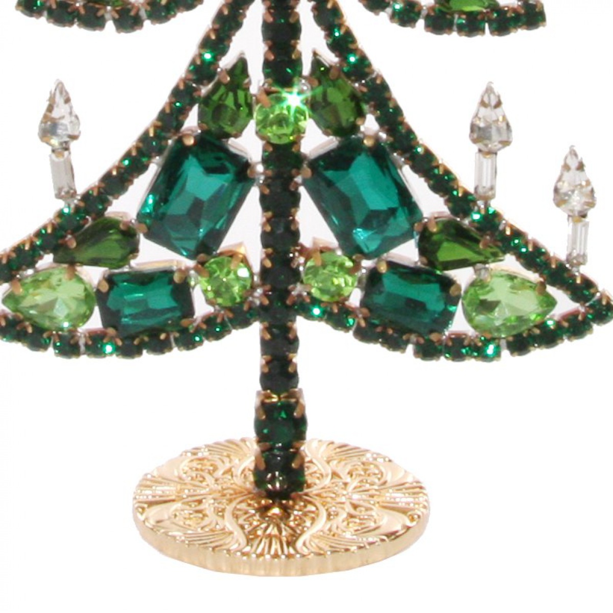 In der Tradition hochwertiger Glasmacherkunst wird auch dieser Gablonzer Retro-Schmuckbaum in Handarbeit gefertigt. Die funkelnden, facettierten Glassteine in Grüntönen sind einzeln gefasst, auf der Rückseite ist die Montur komplett messingfarben.