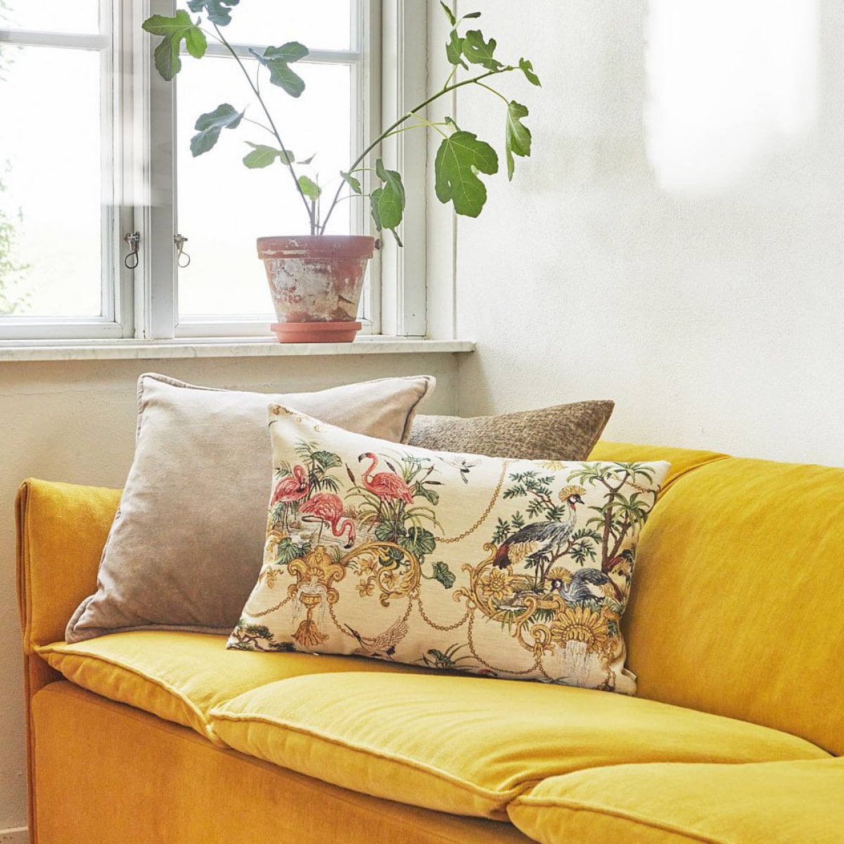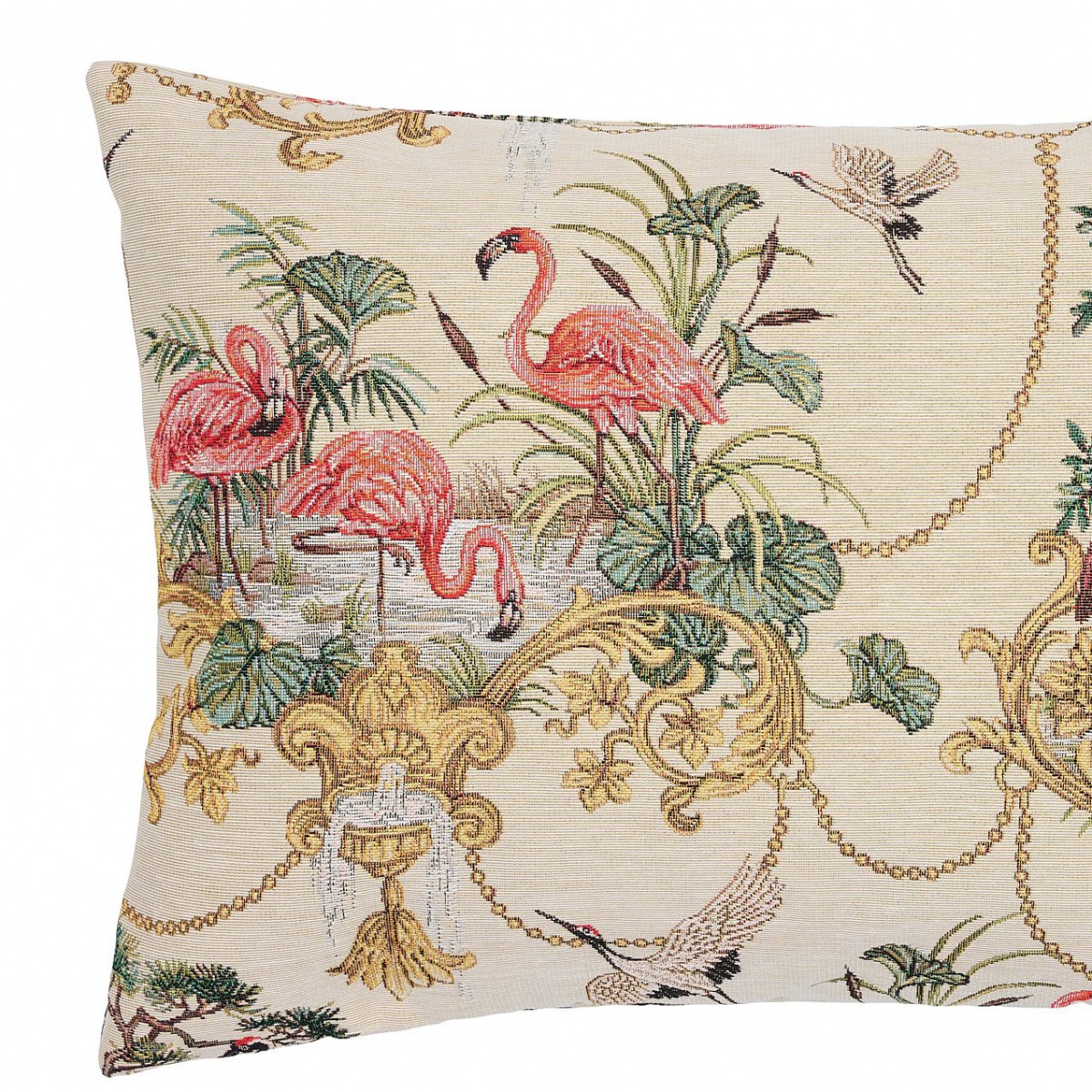 Dieses Gobelin-Kissen ist eine farbenfrohe Hommage an die Vielfalt der Natur. Das Motiv zeigt wunderschön illustrierte exotische Vögel, darunter elegante Flamingos, in lebenigen Farbtönen auf ruhigem beigefarbenem Grund. Das lebendige Motiv sorgt für einen harmonischen und ansprechenden Ausdruck und verleiht Ihrem Zuhause Persönlichkeit und einen Hauch von Exotik.