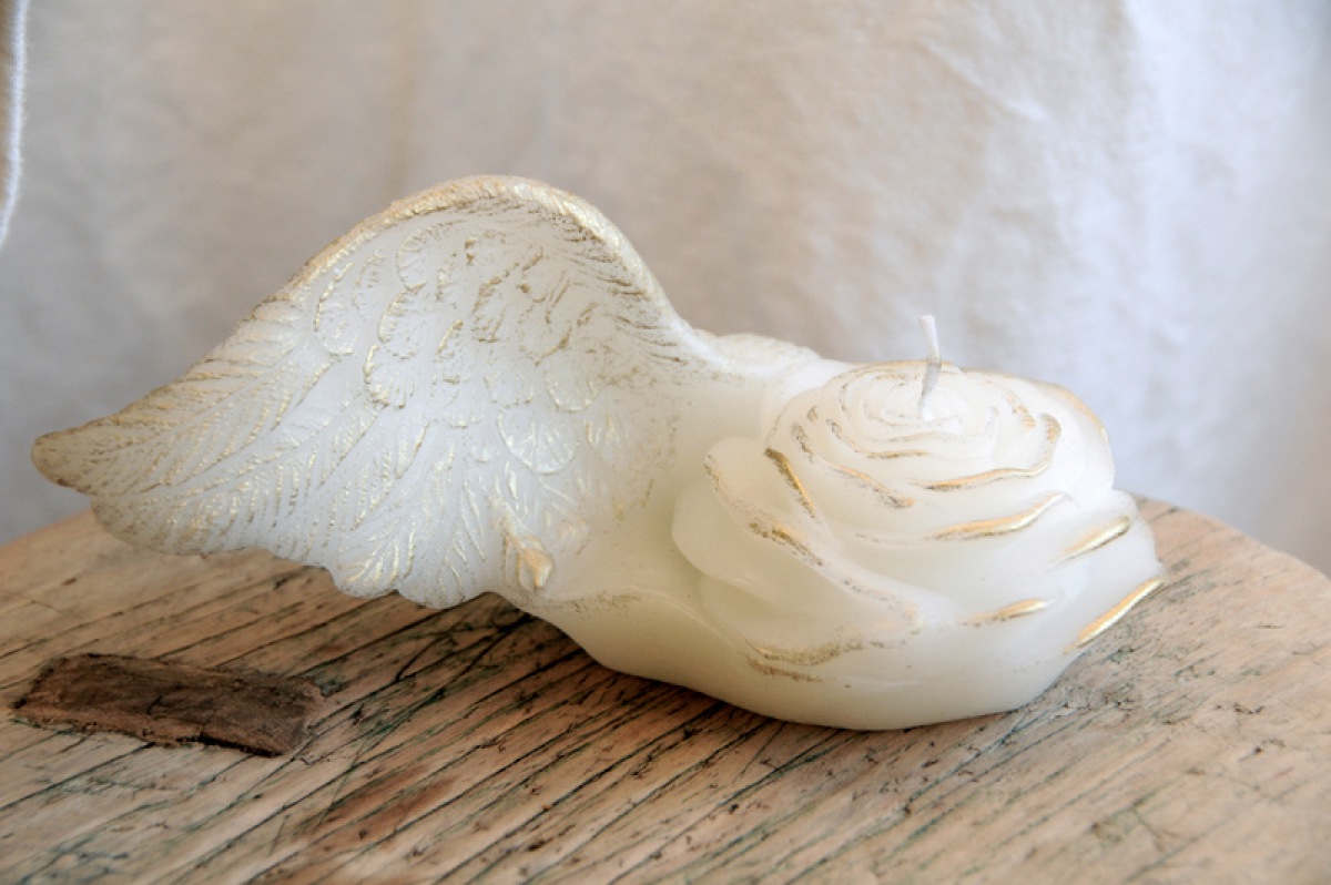 Traumhaft schöne Motivkerze in Form einer Kamelienblüte mit Engelsflügel. Entworfen und gefertigt in Frankreich. Die zarte Goldverzierung des Flügels und der Blüte reflektiert sanft schimmernd das Kerzenlicht.