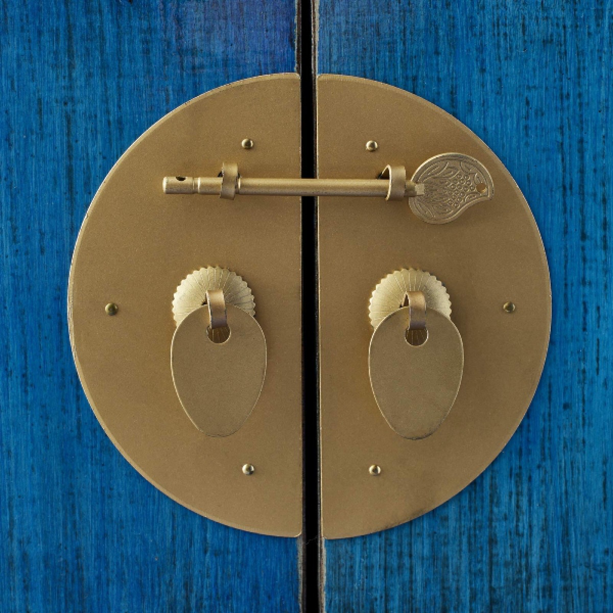Besonders bemerkenswert ist der sogenannte „Möbelstangenverschluss” mit zwei runden Beschlägen mit Ösen, durch die der waagrechte, dekorative Stab geschoben wird, um die beiden Türen zu verriegeln.