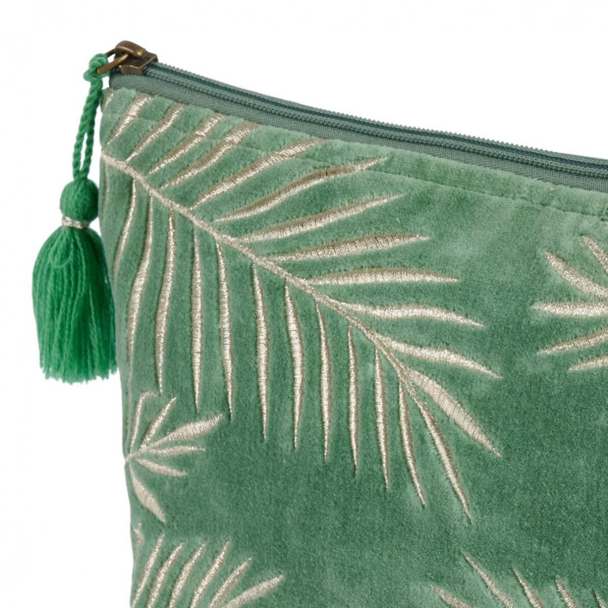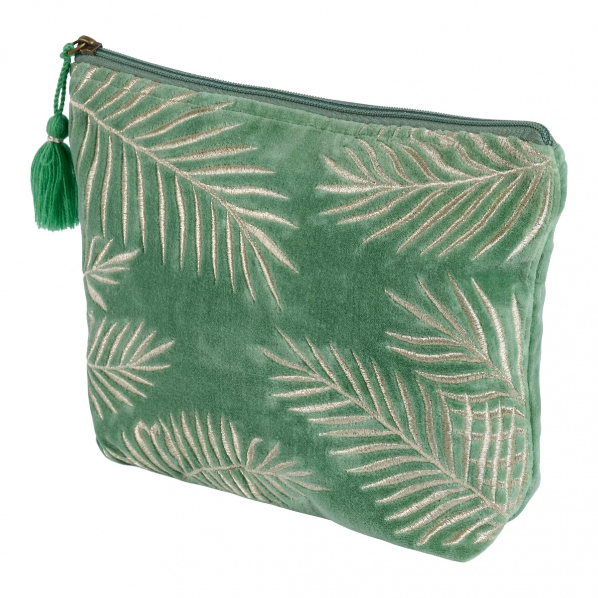 Diese elegante Kosmetiktasche ist aus weichem , samtigen Velours gefertigt und mit einem wunderschönen silberfarbenen Blattmotiv auf puder-grünem Grund bestickt. Die hübsche Quaste vollendet dieses Lieblingstäschchen.