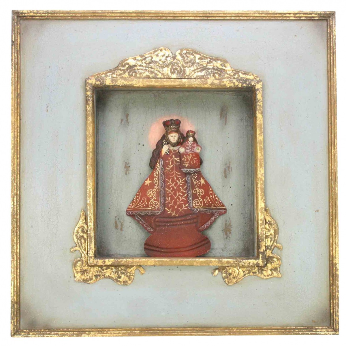 Ein sehr schön gefertigter Marien-Altarkasten mit plastisch figuraler Darstellung einer Maria Figur mit Kind. Geschützt hinter Glas in einem gerahmten "Bild"-Kasten mit Antik Patinierung, auf der Rückseite befindet sich eine Aufhängevorrichtung.