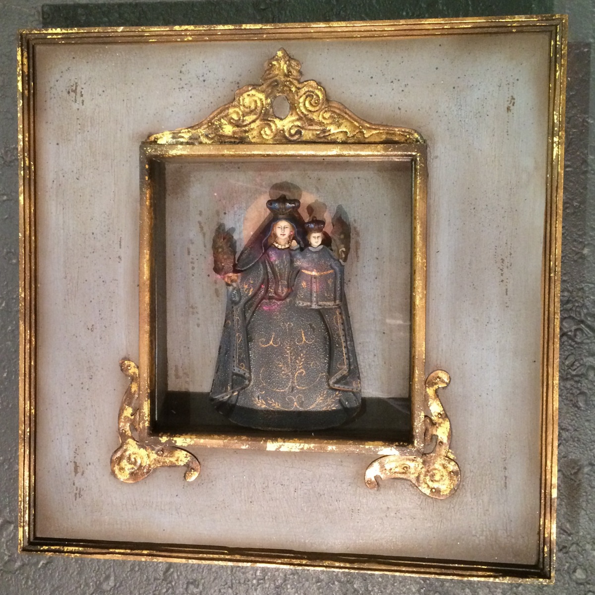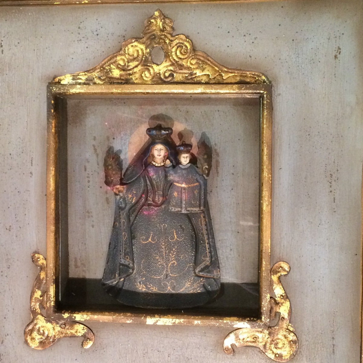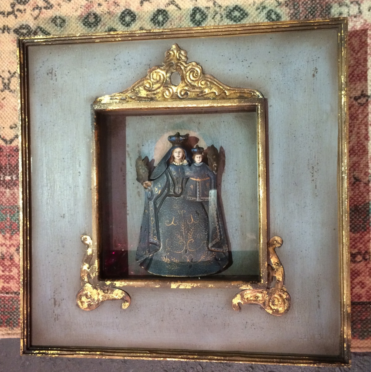 Ein sehr schön gefertigter Marien-Altarkasten mit plastisch figuraler Darstellung einer Mariafigur mit Kind. Geschützt hinter Glas und kompakt in einem gerahmten "Bild"-Kasten mit antik Patinierung, auf der Rückseite befindet sich eine Aufhängevorrichtung.