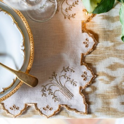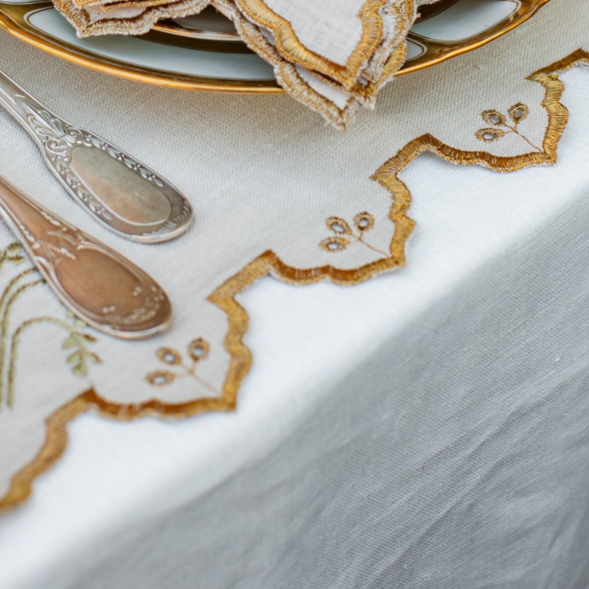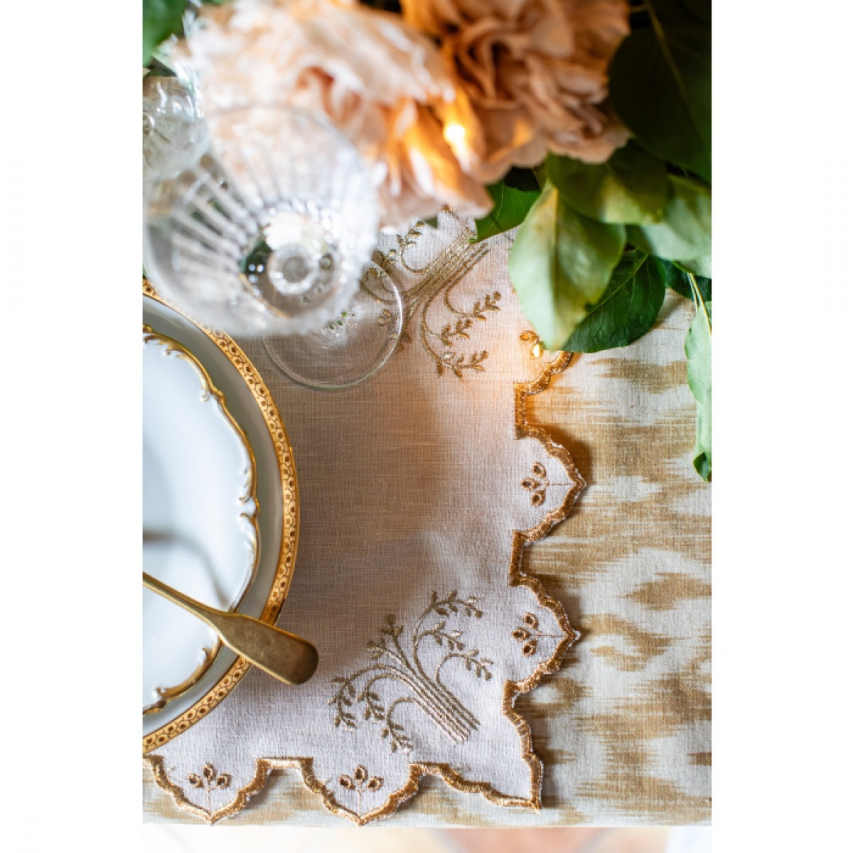 Klassische Eleganz - Tischset aus Leinen in einem hellen Naturleinen Farbton - eine edle Kombination zu den weißen Servietten "Goldene Festtage" - reich bestickt mit floralen Motiven aus glänzenden Lurex Fäden und gestickter, edler, aufwendiger Muster Kontur.