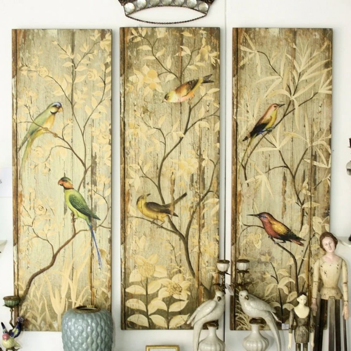 3 hochwertige Wandtafeln aus Holz mit Malerei und stimmungsvoller Antik Patinierung, zur Wandbefestigung ist jeweils nur ein Nagel erforderlich.
