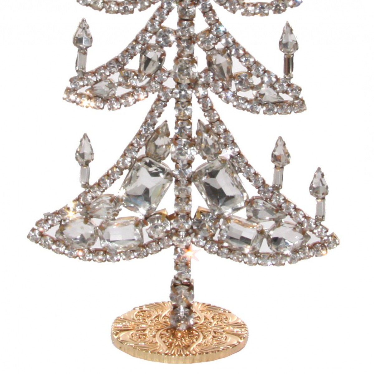 In der Tradition hochwertiger Glasmacherkunst wird auch dieser Gablonzer Retro-Schmuckbaum in Handarbeit gefertigt. Die funkelnden, facettierten glasklaren Glassteine sind einzeln gefasst, auf der Rückseite ist die Montur komplett messingfarben.