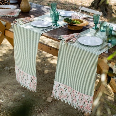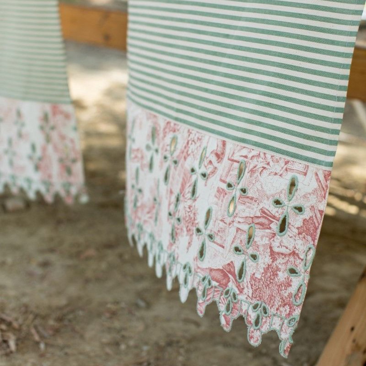 Hochwertige Cut-Work und Stick Muster Randbordüre auf elegantem Toile de Jouy Muster in einer frischen Kombination mit Streifenstoff.