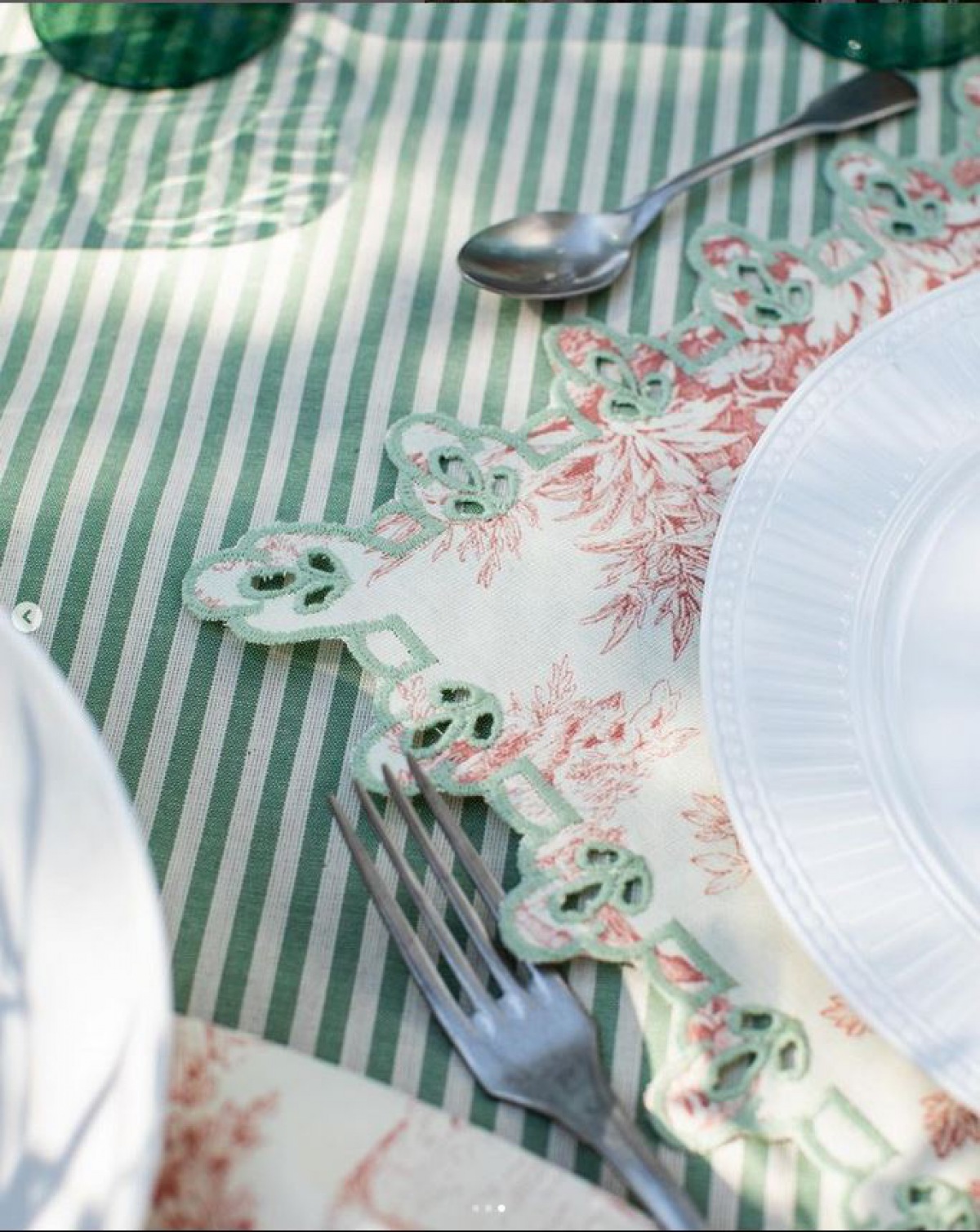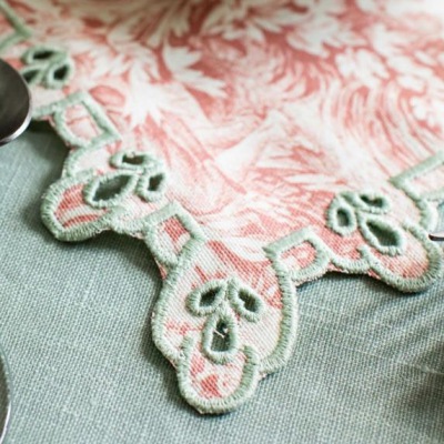 Hochwertige Cut-Work und Stick Muster Randbordüre und feines Toile de Jouy Muster in einer eleganten Farben Komposition.