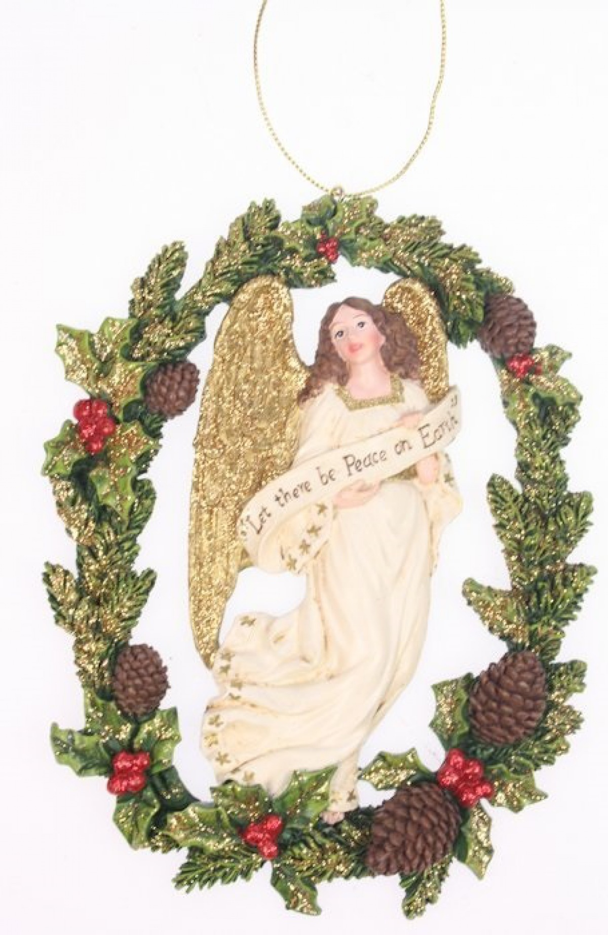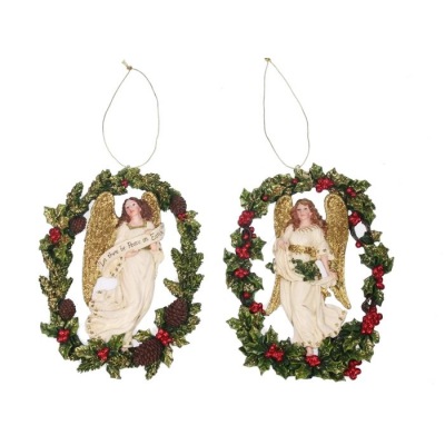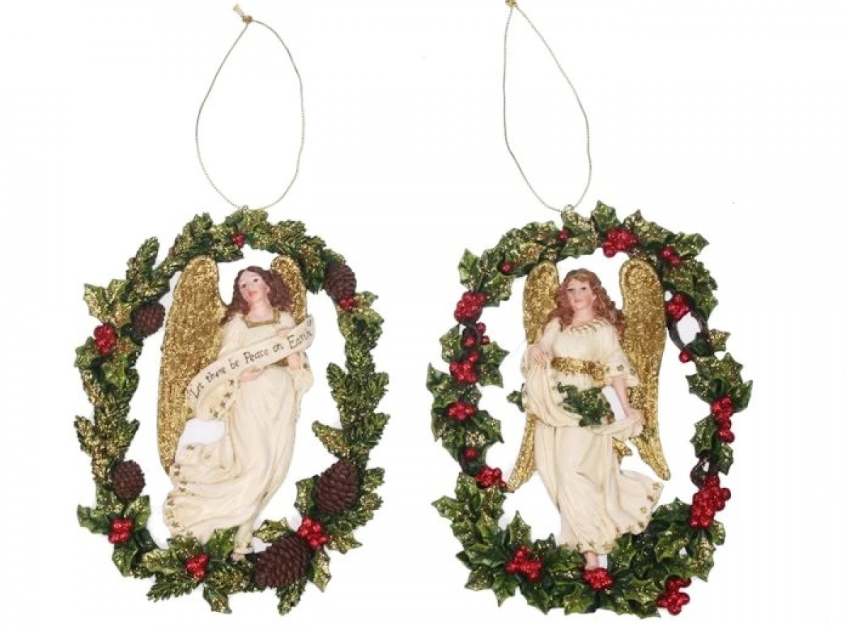 Viktorianischer Weihnachtsschmuck - wunderschön gearbeitete Engelsfiguren, umrahmt von einem Kranz aus Blättern mit roten Beeren, dezent funkelnd.
