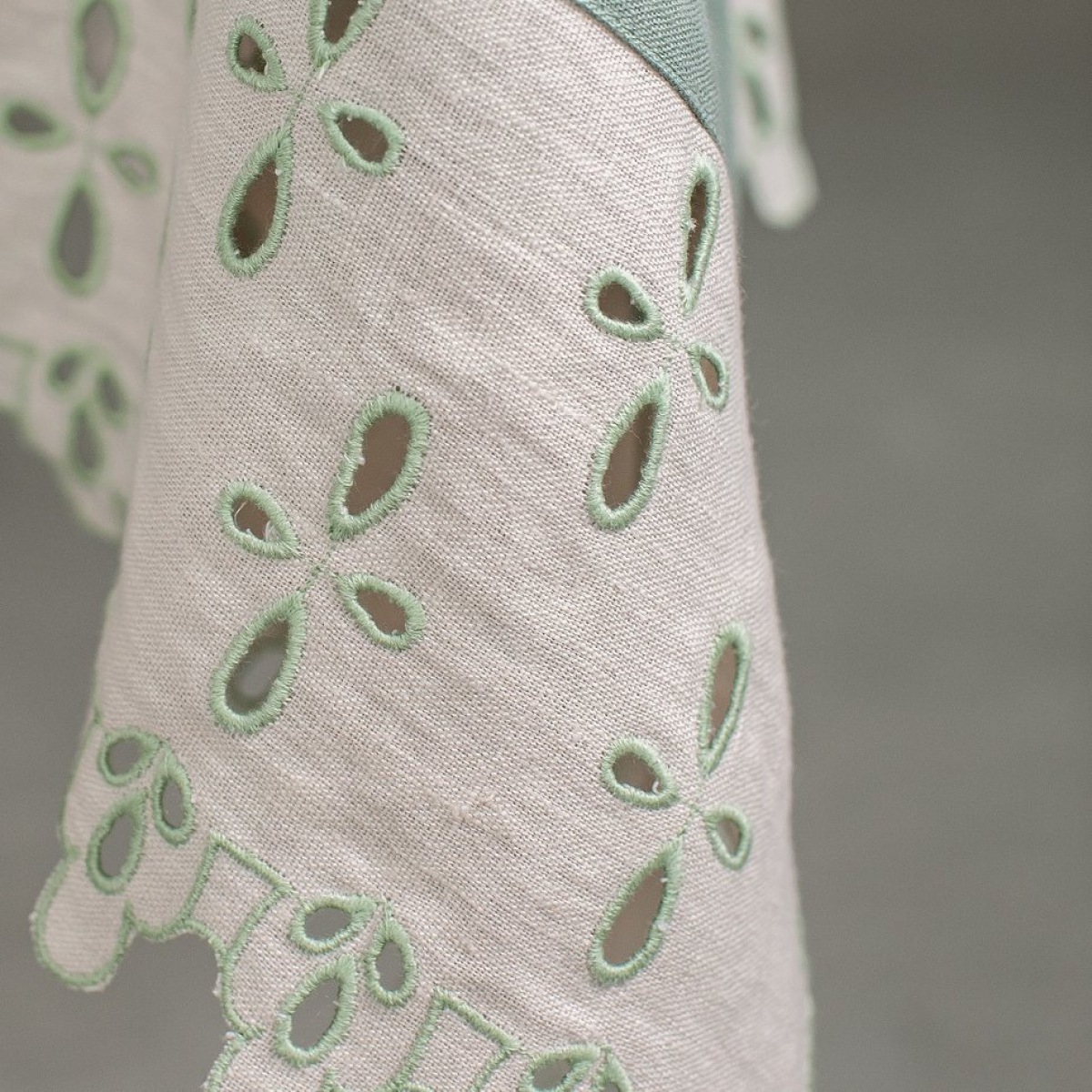 STIL - ergänzen Sie edel die Tischdecke mit den 100% Leinen Servietten & Tischsets (45 x 45 cm) in der Grundfarbe der Bordüre und Salbei Cut out Stickerei.