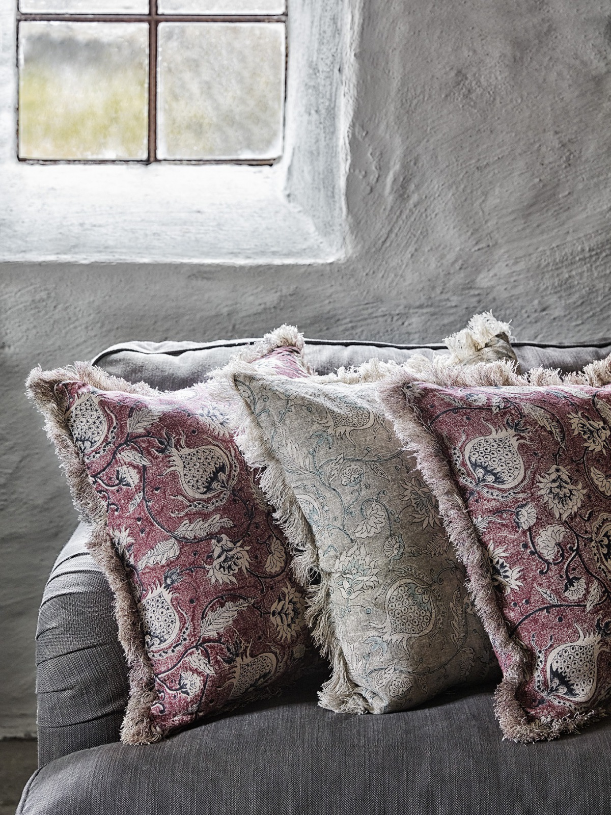 Kissen mit besonderem Charme für ein gemütliches Wohnambiente. Der weiche Leinenstoff von Chamois rot wird sorgfältig von Hand mit Farben aus natürlichen Farbpigmenten bedruckt. Jede Kissenhülle ist einzigartig und bezaubert mit individueller Schönheit.